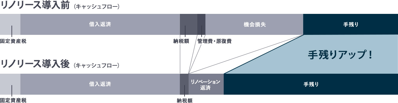 リノリースCLUBが大家様の空室を借りることで、大家様の手元に残るキャッシュが多くなります。