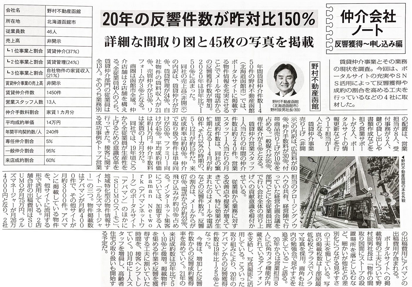 リノリースCLUB加盟店「野村不動産函館株式会社 様」の記事が2021年10月11日発行の全国賃貸住宅新聞に掲載されました。