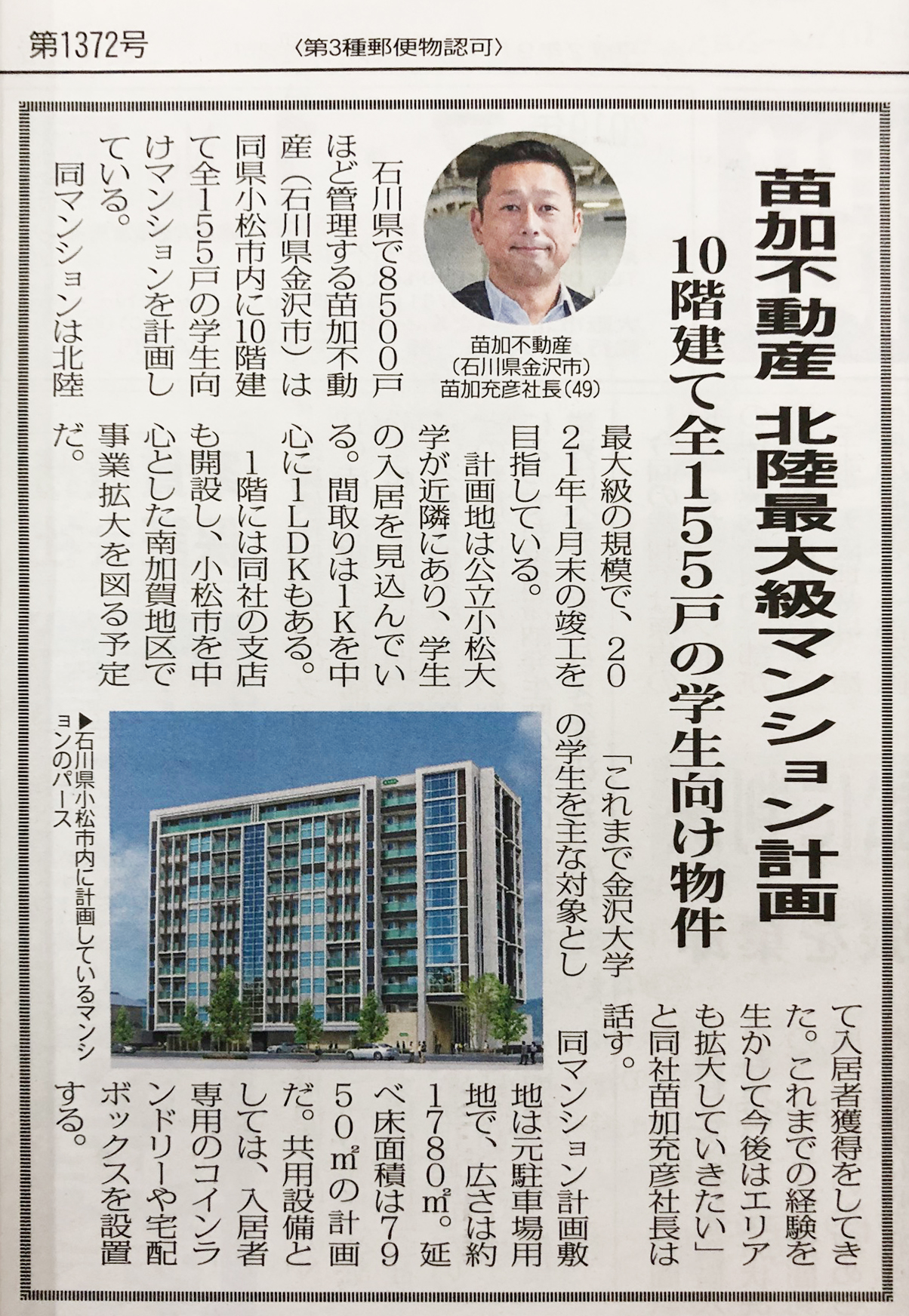 リノリースCLUB加盟店「株式会社苗加不動産様」の記事が2019年7月1日発行の全国賃貸住宅新聞に掲載されました。