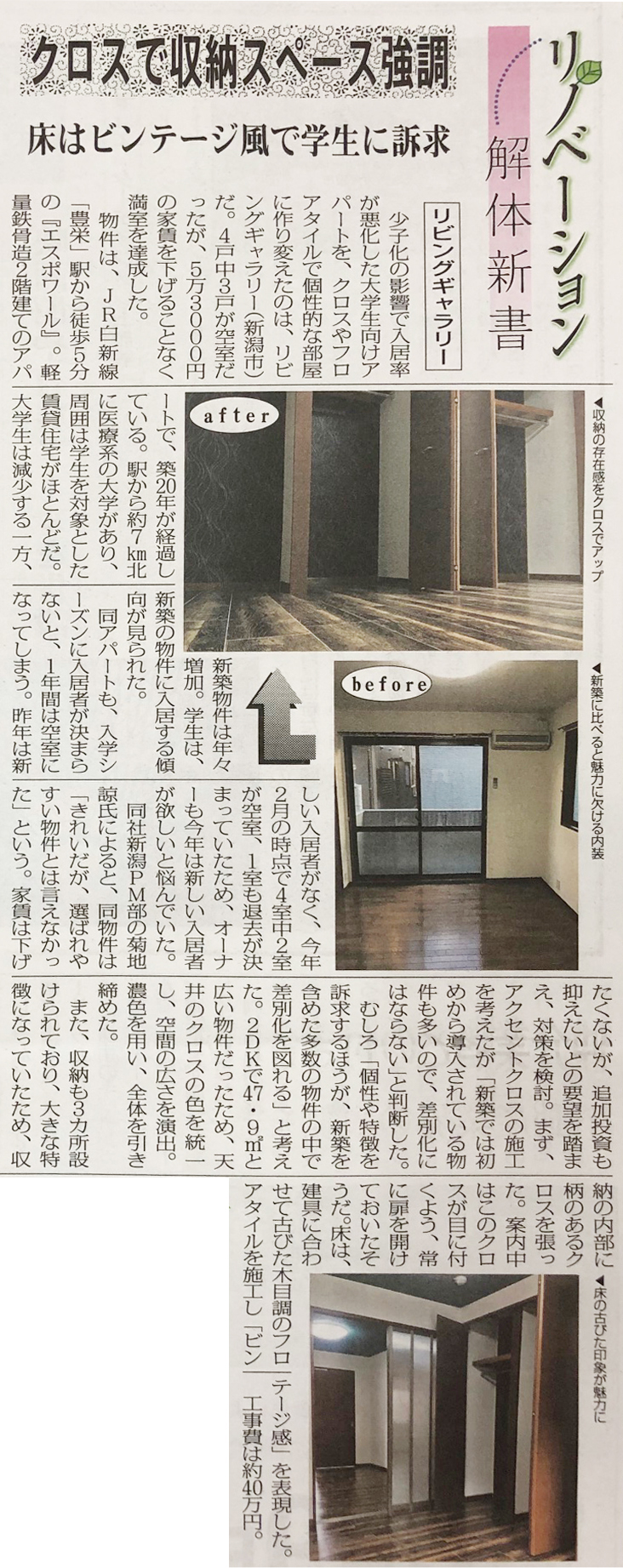 リノリースCLUB加盟店様 全国賃貸住宅新聞に記事が掲載されました