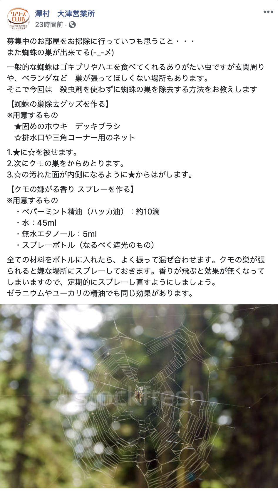リノリースCLUB加盟店「株式会社澤村 様」が賃貸物件での蜘蛛の巣除去について情報を発信されました。