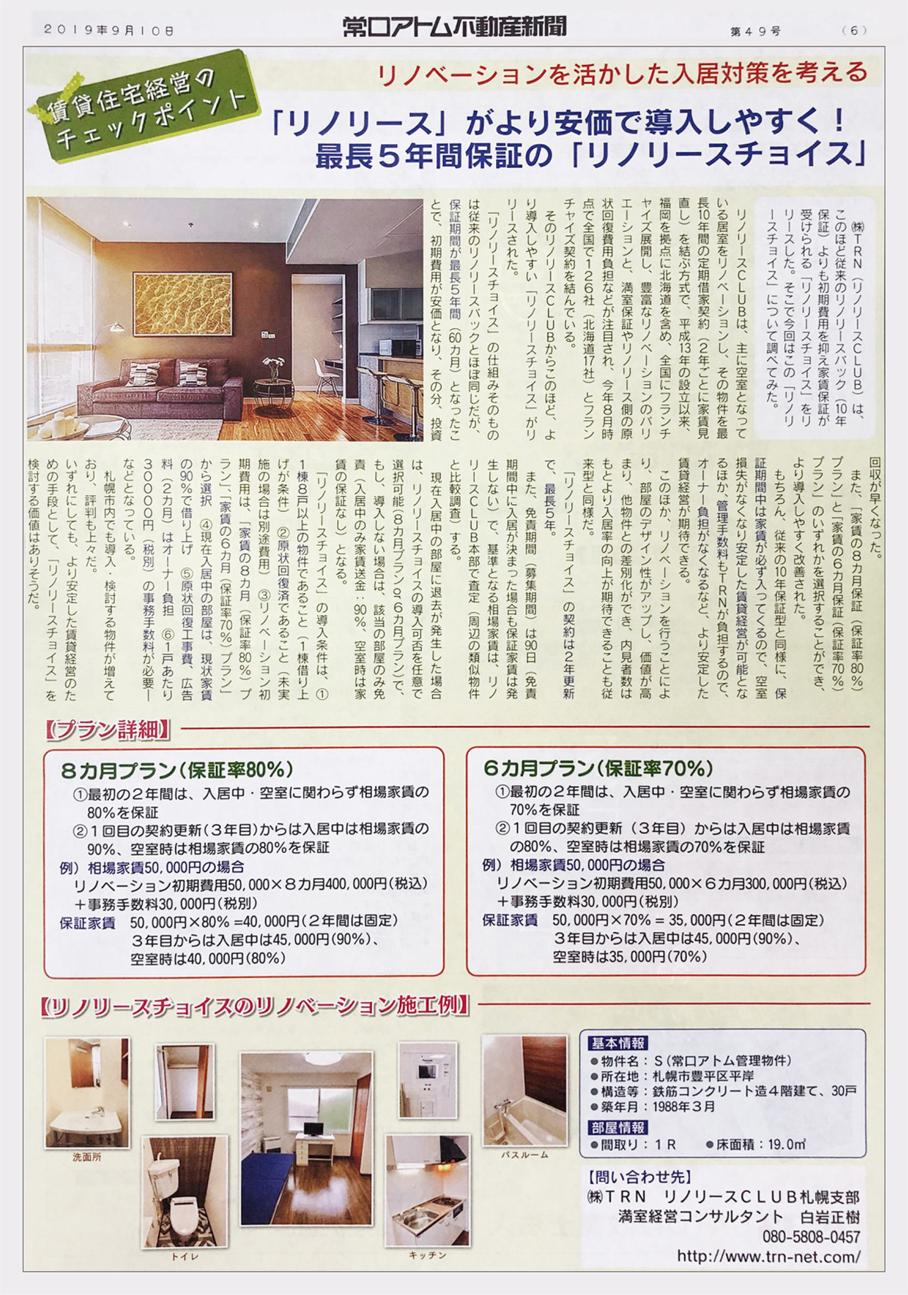 2019年9月10日発行の常口アトム不動産新聞にリノリースの記事が掲載されました。