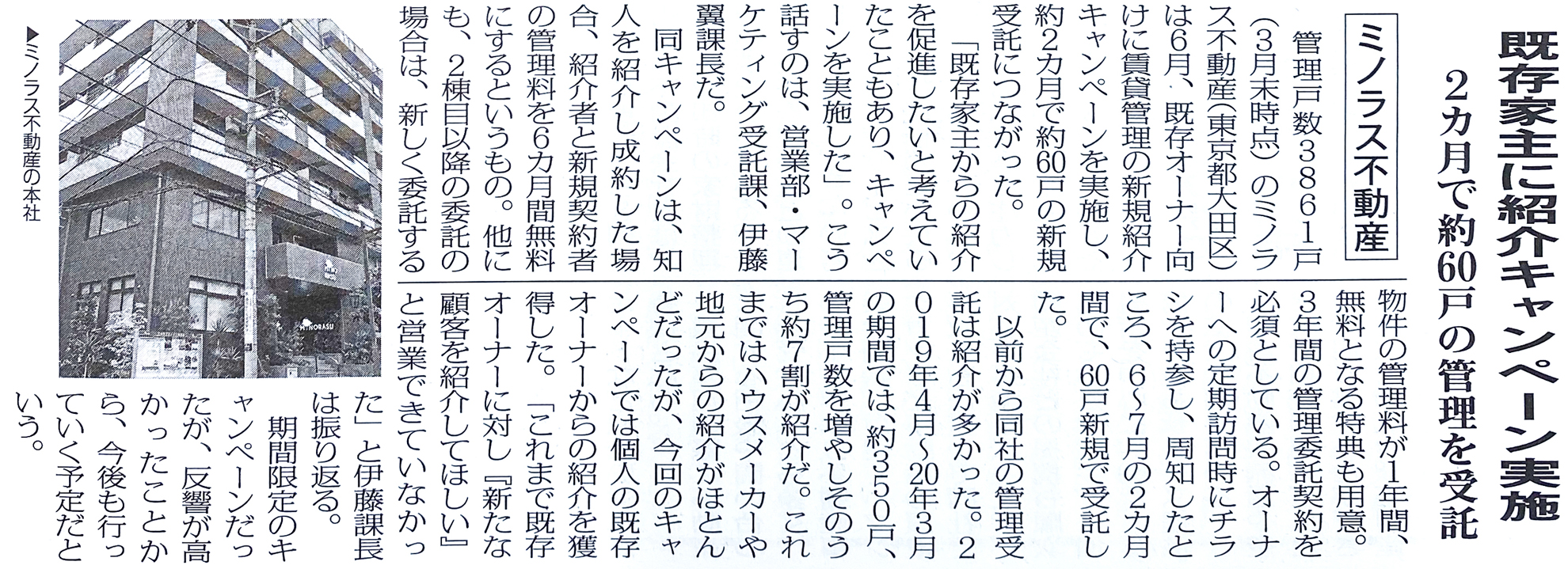 リノリースCLUB加盟店「ミノラス不動産株式会社 様」の記事が2020年8月17日発行の全国賃貸住宅新聞に掲載されました。