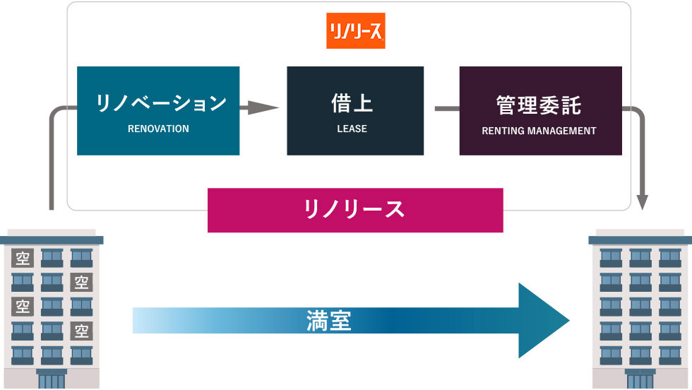 空室をリノベーションし、借り上げた物件の管理を委託し満室にします。